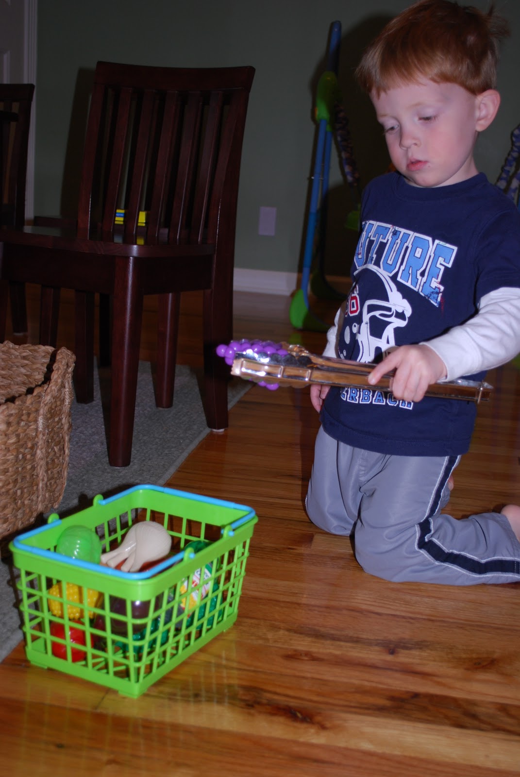 Pick up all the play fruit and veggies with the tongs, put them in the basket, then dump it out again.